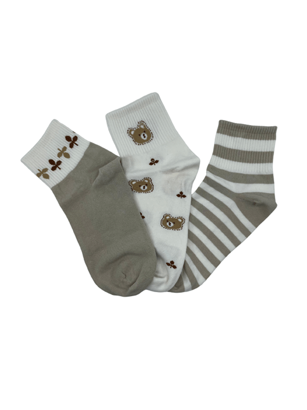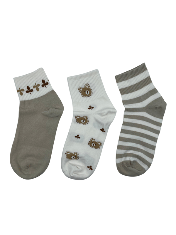 Günlük kullanım için ideal, yumuşak ve konforlu 3'lü bayan çorap seti! Sevimli ayıcık, çiçek desenleri ve çizgili tasarımıyla hem şık hem eğlenceli. Elastik yapısı sayesinde ayağa tam oturur, rahatsızlık vermez. Dört mevsim rahatlıkla kullanılabilir.